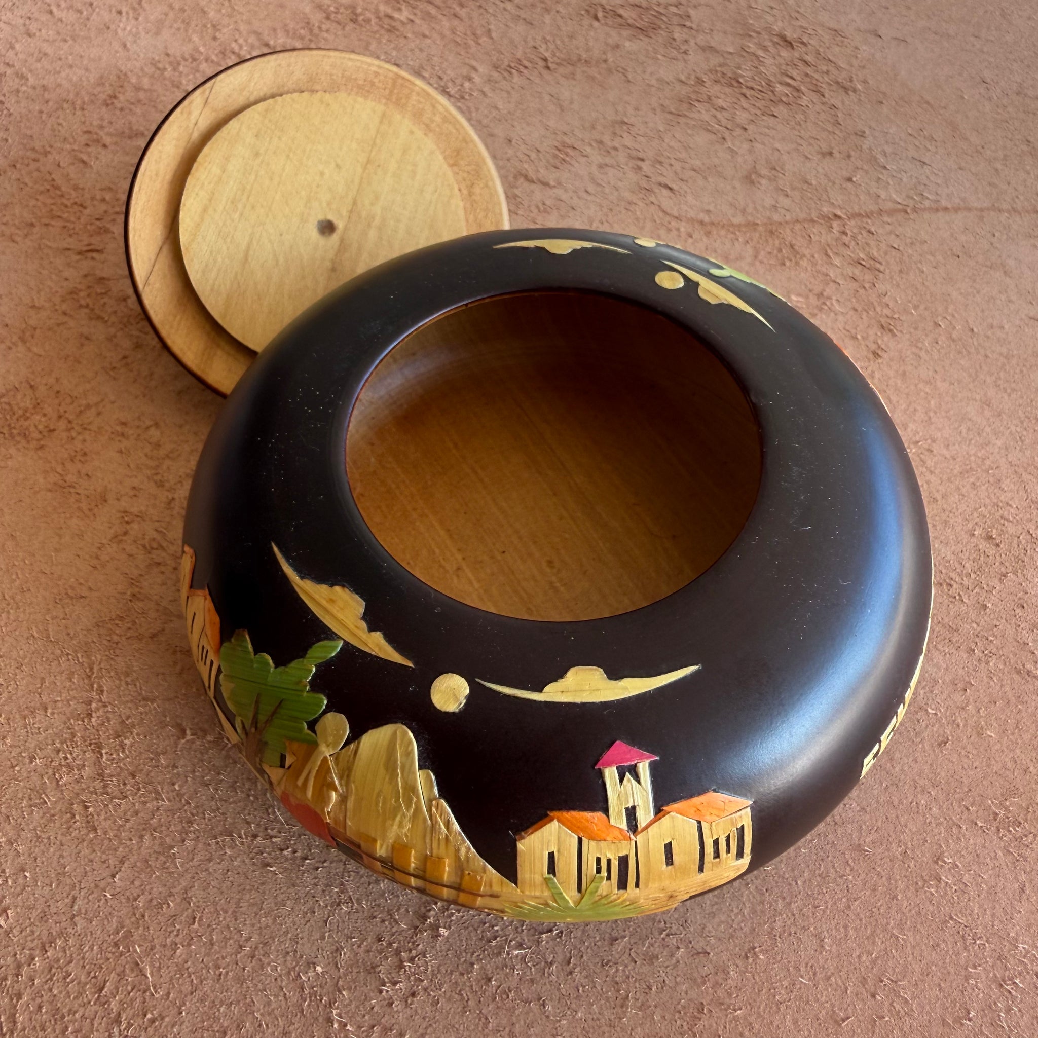 This handmade wood jar is a great way to store your rings, coins, and small items in your desk. It is a great representation of Ecuador. All the details and designs are done in wood. Great Decor!